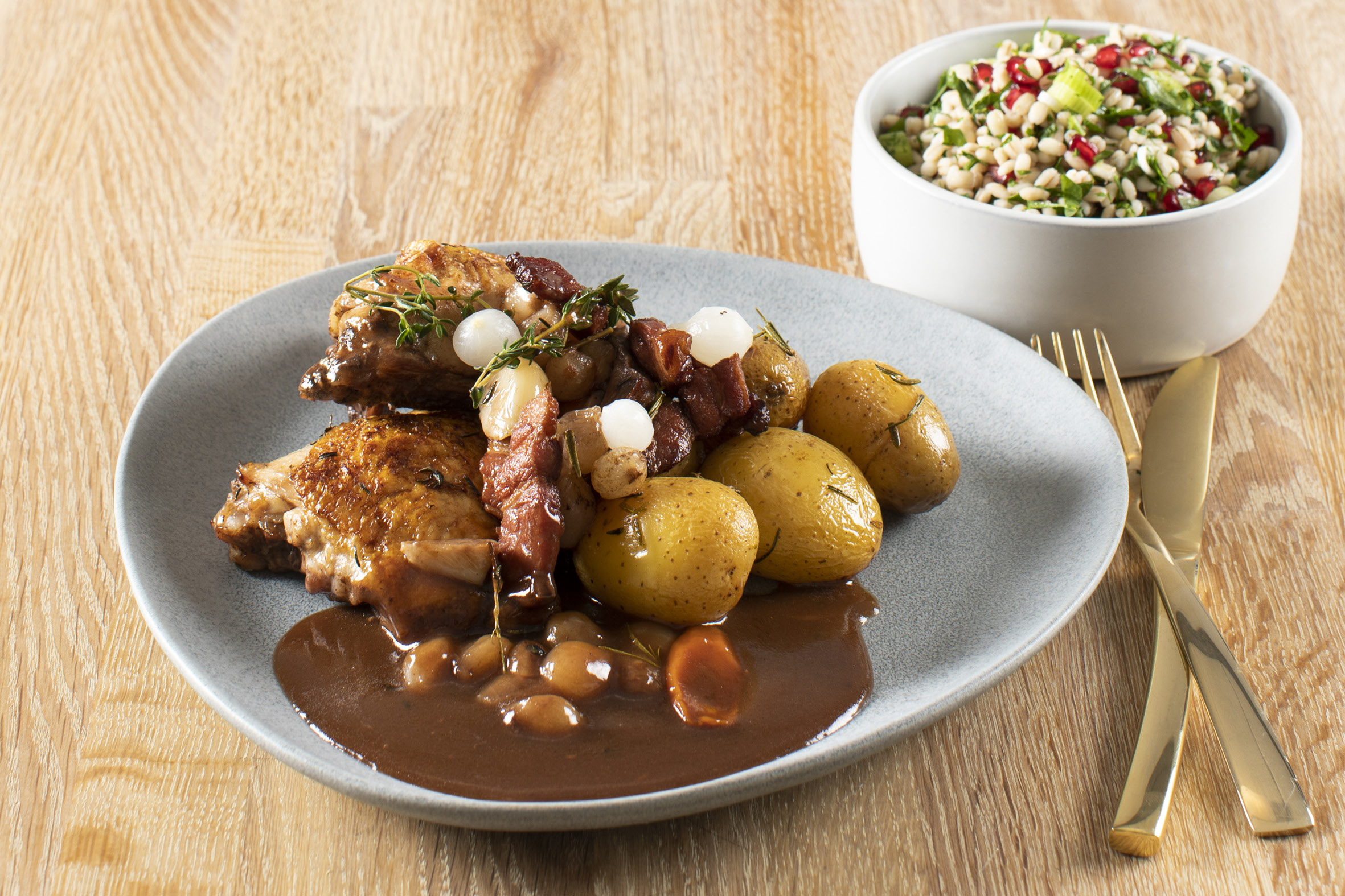 Coq au vin med stegte kartofler og perlebygsalat.